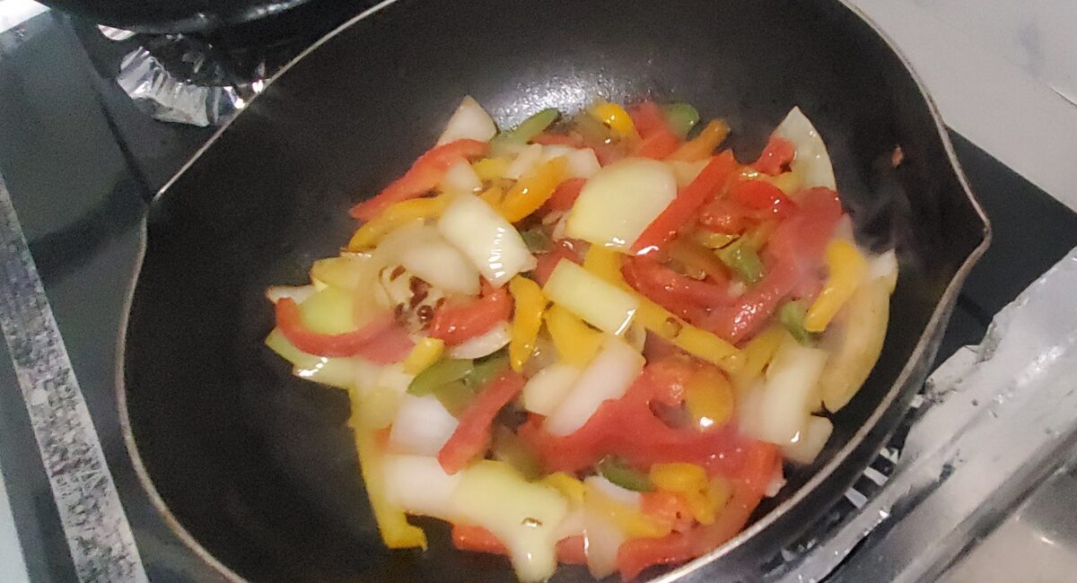 【5】違うフライパンを用意して、野菜を炒める